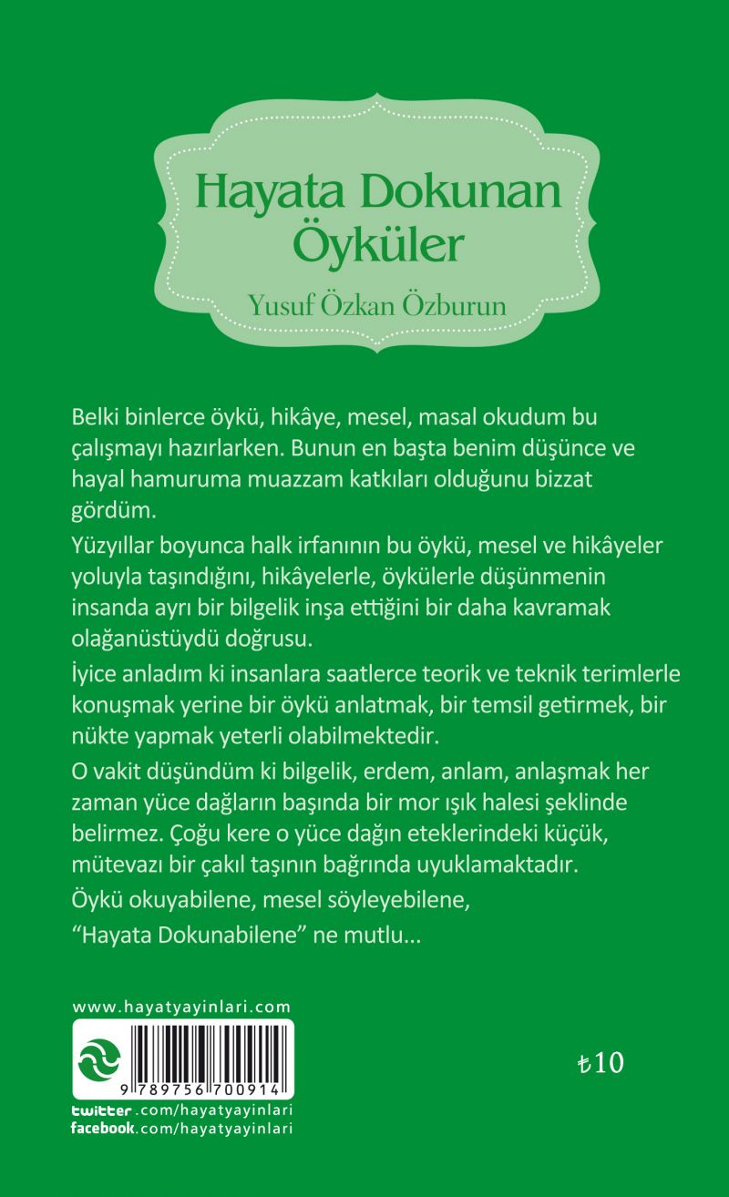 Belki binlerce öykü, hikaye, mesel, masal okudum bu çalışmayı hazırlarken. Bunun en başta benim düşünce ve hayal hamuruma muazzam katkıları olduğunu bizzat gördüm.Yüzyıllar boyunca halk irfanın bu öykü, mesel ve hikayeler yoluyla taşındığını, hikayelerle, öykülerle düşünmenğn insanda ayrı bir bilgelik inşa ettiğini bir daha kavramak olağanüstüydü doğrusu.İyice anladım ki insanlara saatlerce teorik ve teknik terimlerle konuşmak yerine bir öykü anlatmak, bir temsil getirmek, bir nükte yapmak yeterli olabilmektedir. O vakit düşündüm ki bilgelik, erdem, anlam, anlaşmak her zaman yüce dağların başında bir mor ışık halesi şeklinde belirmez. Çoğu kere o yüce dağın eteklerindeki küçük mütevazı bir çakıl taşının bağrında uyuklamaktadır.Öykü okuyabilene,mesel söyleyebilene,'Hayata Dokunabilene' ne mutlu...