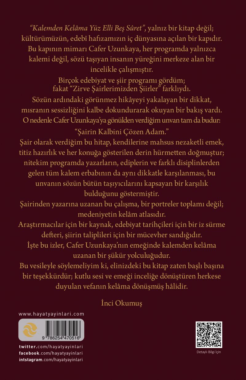 Şairinden yazarına uzanan bu çalışma, bir portreler toplamı değil; medeniyetin kelâm atlasıdır. Araştırmacılar için bir kaynak, edebiyat tarihçileri için bir iz sürme defteri, şiirin taliplileri için bir mücevher sandığıdır. İşte bu izler, Cafer Uzunkaya’nın emeğinde kalemden kelâma uzanan bir şükür yolculuğudur.