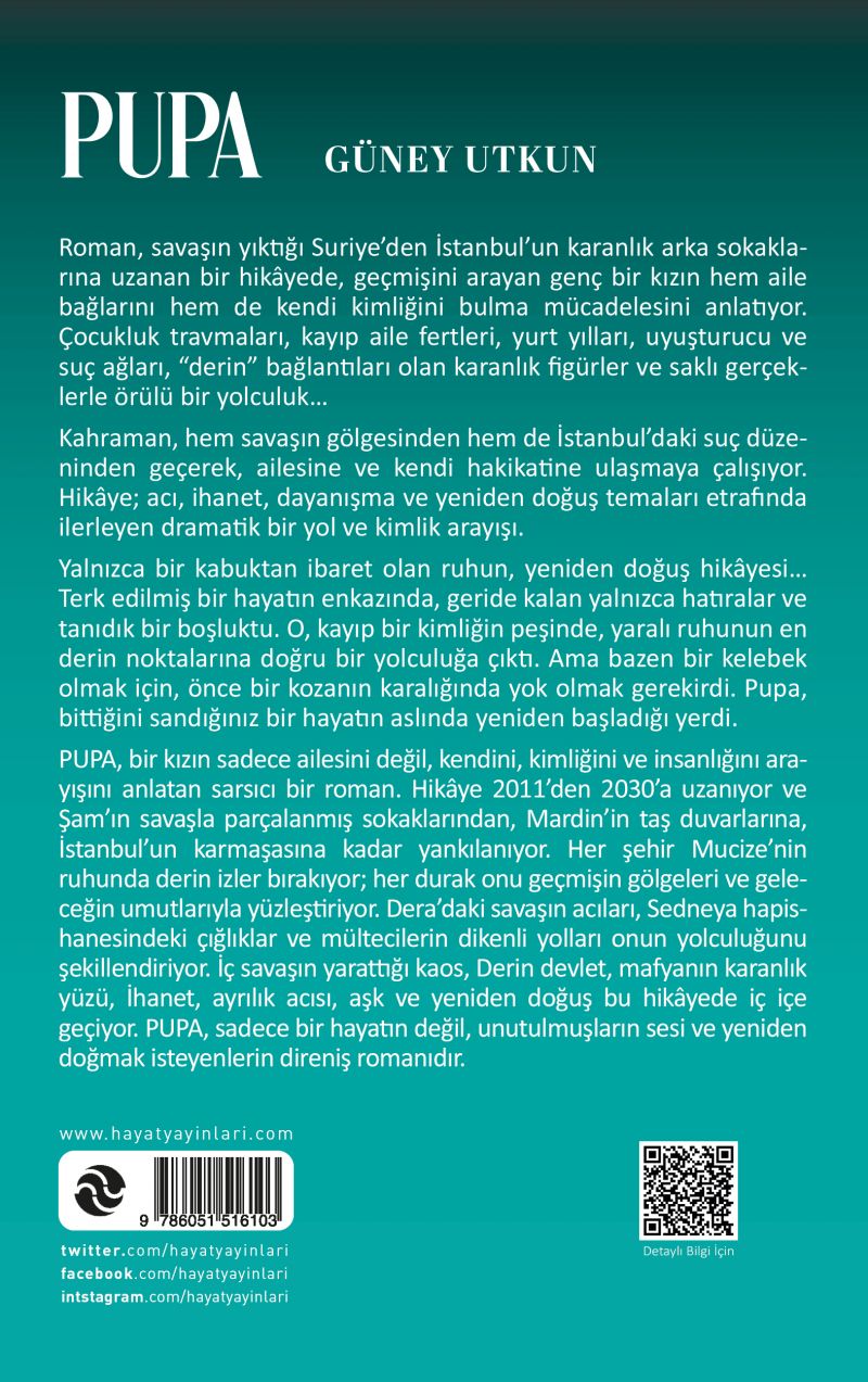 PUPA, bir kızın sadece ailesini değil, kendini, kimliğini ve insanlığını arayışını anlatan sarsıcı bir roman. Hikâye 2011’den 2030’a uzanıyor ve Şam’ın savaşla parçalanmış sokaklarından, Mardin’in taş duvarlarına, İstanbul’un karmaşasına kadar yankılanıyor. Her şehir Mucize’nin ruhunda derin izler bırakıyor; her durak onu geçmişin gölgeleri ve geleceğin umutlarıyla yüzleştiriyor. Dera’daki savaşın acıları, Sedneya hapishanesindeki çığlıklar ve mültecilerin dikenli yolları onun yolculuğunu şekillendiriyor. İç savaşın yarattığı kaos, Derin devlet, mafyanın karanlık yüzü, İhanet, ayrılık acısı, aşk ve yeniden doğuş bu hikâyede iç içe geçiyor. PUPA, sadece bir hayatın değil, unutulmuşların sesi ve yeniden doğmak isteyenlerin direniş romanıdır.