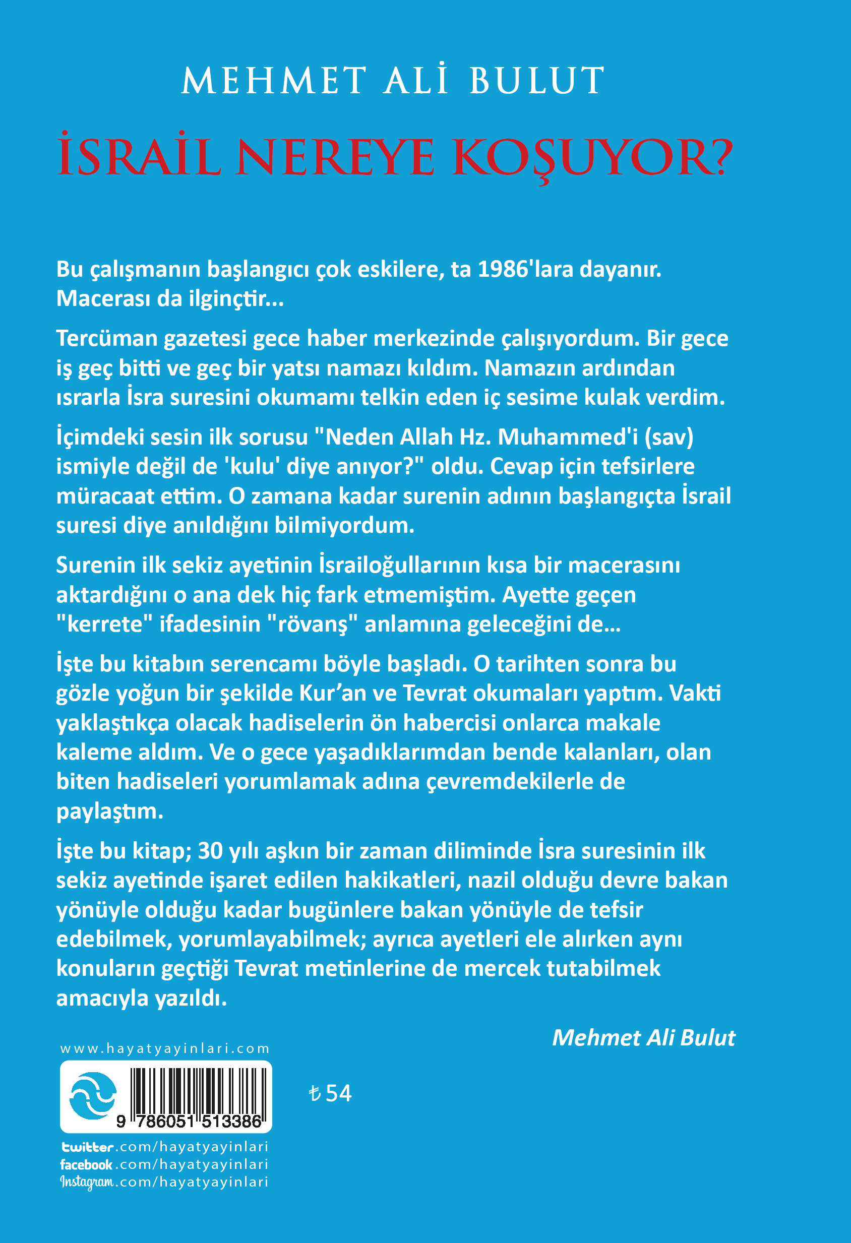 İşte bu kitap; 30 yılı aşkın bir zaman diliminde İsra suresinin ilk sekiz ayetinde işaret edilen hakikatleri, nazil olduğu devre bakan yönüyle olduğu kadar bugünlere bakan yönüyle de tefsir edebilmek, yorumlayabilmek; ayrıca ayetleri ele alırken aynı konuların geçtiği Tevrat metinlerine de mercek tutabilmek amacıyla yazıldı.