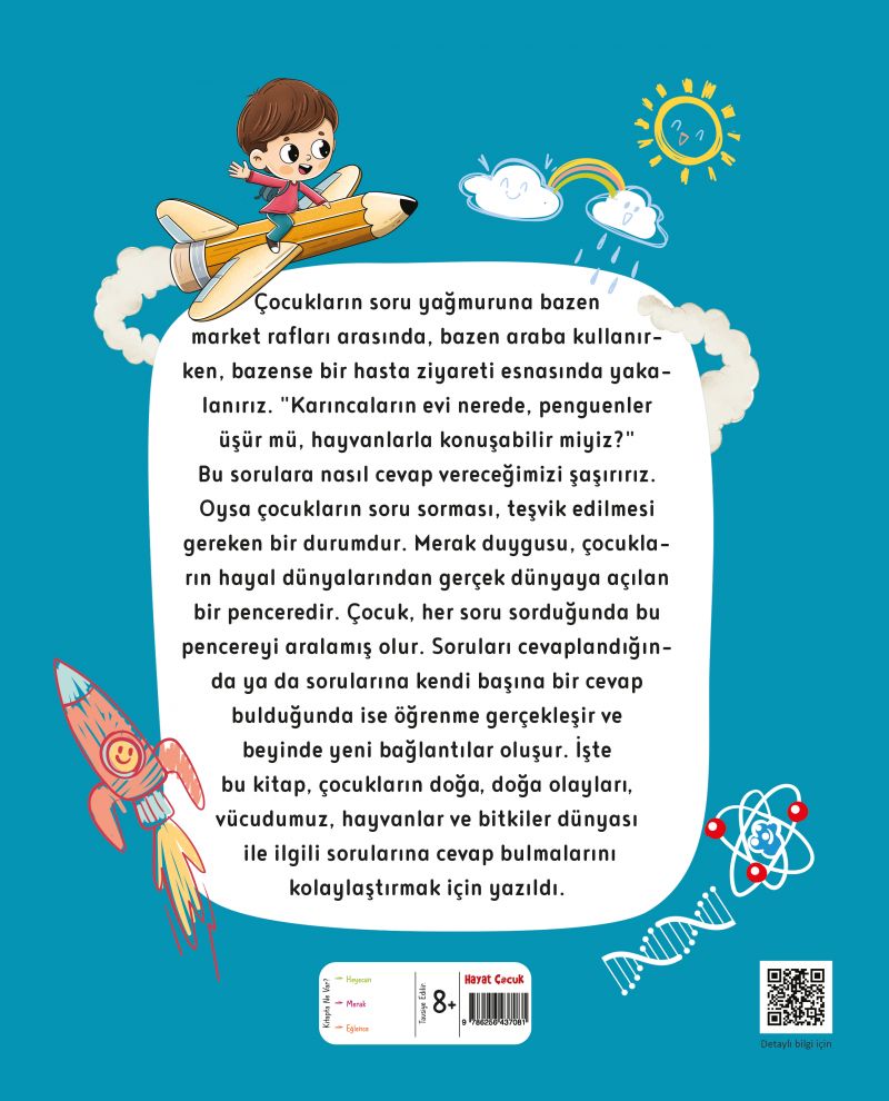 İşte bu kitap, çocukların doğa, doğa olayları, vücudumuz, hayvanlar ve bitkiler dünyası ile ilgili sorularına cevap bulmalarını kolaylaştırmak için yazıldı.