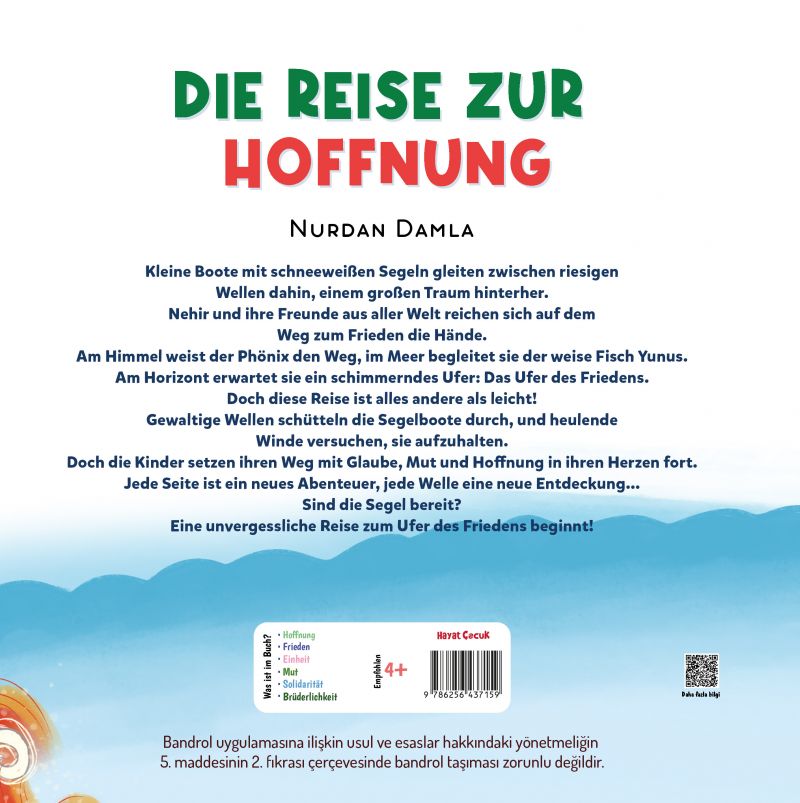 Kleine Boote mit schneeweißen Segeln gleiten zwischen riesigen Wellen dahin, einem großen Traum hinterher. Nehir und ihre Freunde aus aller Welt reichen sich auf dem Weg zum Frieden die Hände. Am Himmel weist der Phönix den Weg, im Meer begleitet sie der weise Fisch Yunus. Am Horizont erwartet sie ein schimmerndes Ufer: Das Ufer des Friedens. Doch diese Reise ist alles andere als leicht! Gewaltige Wellen schütteln die Segelboote durch, und heulende Winde versuchen, sie aufzuhalten. Doch die Kinder setzen ihren Weg mit Glaube, Mut und Hoffnung in ihren Herzen fort. Jede Seite ist ein neues Abenteuer, jede Welle eine neue Entdeckung... Sind die Segel bereit? Eine unvergessliche Reise zum Ufer des Friedens beginnt!