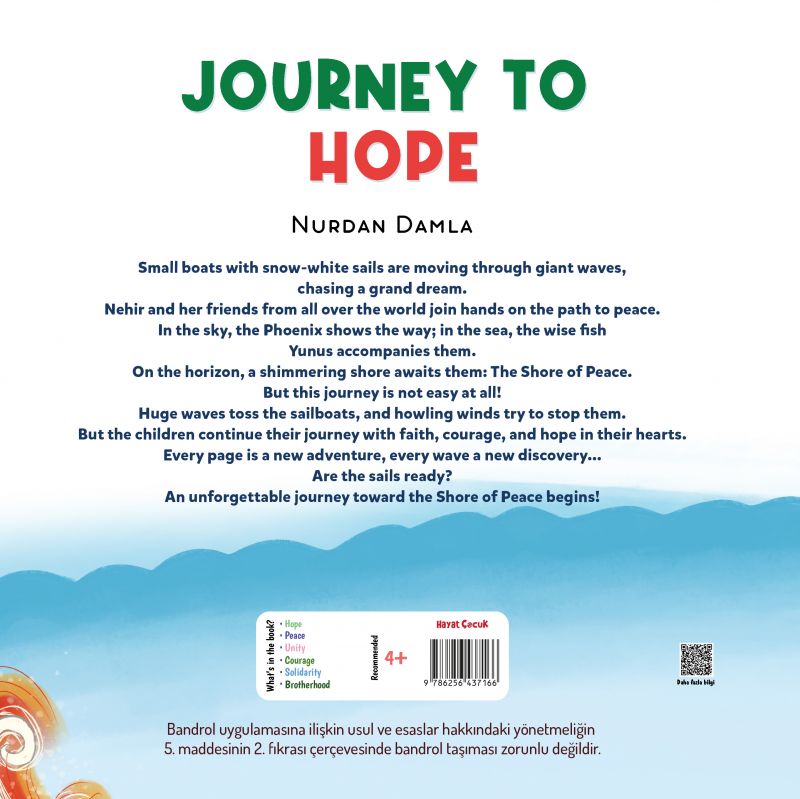Small boats with snow-white sails are moving through giant waves, chasing a grand dream. Nehir and her friends from all over the world join hands on the path to peace. In the sky, the Phoenix shows the way; in the sea, the wise fish Yunus accompanies them. On the horizon, a shimmering shore awaits them: The Shore of Peace. But this journey is not easy at all! Huge waves toss the sailboats, and howling winds try to stop them. But the children continue their journey with faith, courage, and hope in their hearts. Every page is a new adventure, every wave a new discovery... Are the sails ready? An unforgettable journey toward the Shore of Peace begins!
